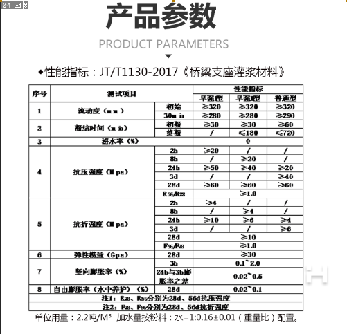 2、早強高強:24小時抗壓強度可達到最終強度的30%,3天達60%以上,在l-3天內(nèi)安裝設(shè)備。