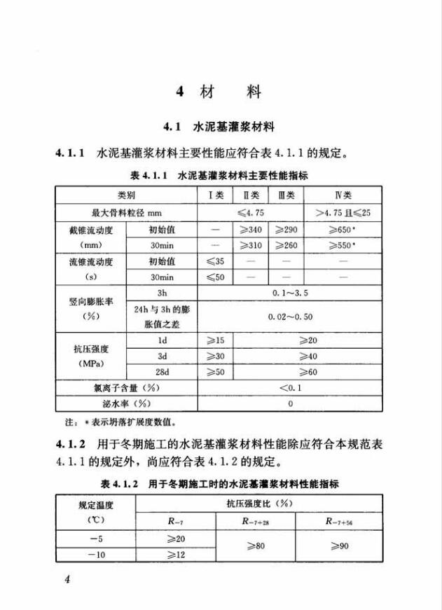 對于快凝快硬型水泥基灌漿材料,由于早期強(qiáng)度高,甚至2h的抗壓強(qiáng)度能達(dá)到20MPa,其流動性損失必然大,因此表4.1.1的30min流動度保留值不適用于快凝快硬型水泥基灌漿材料。本規(guī)范對該類水泥基灌漿材料的流動度(或坍落度和坍落擴(kuò)展度)的保留值、24h與3h的豎向膨脹率之差及24h內(nèi)抗壓強(qiáng)度值不作規(guī)定。